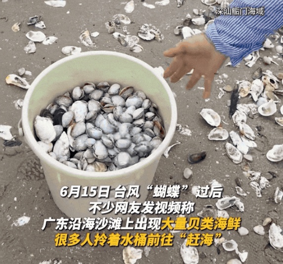 2025年6月,台风“蝴蝶”过后,不少网友发视频称,广东沿海附近的海滩上惊现大量生蚝、毛蚶等贝类海鲜,不少人拎着水桶,拿着袋子前往“赶海”。